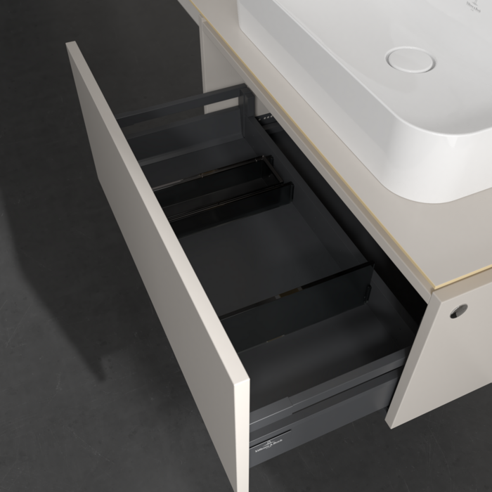 Практичные внутренние перегородки. Продуманные внутренние перегородки в мебели для ванной комнаты Villeroy & Boch позволяют индивидуально поддерживать порядок в ванной комнате. Различные элементы, такие как регулируемые стеклянные перегородки и ящики для аксессуаров различных размеров, обеспечивают порядок и хороший обзор.