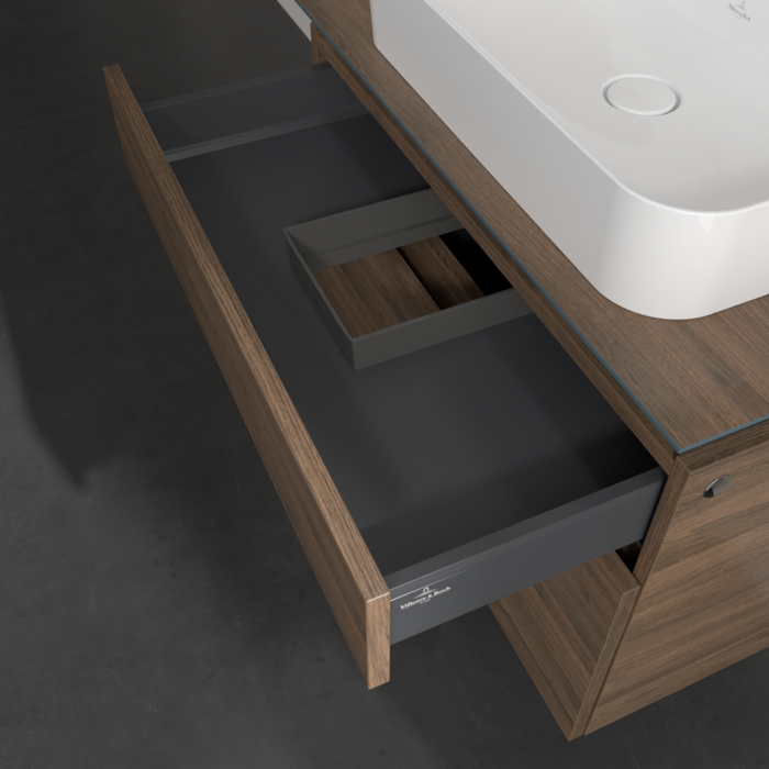 Практичные внутренние перегородки. Продуманные внутренние перегородки в мебели для ванной комнаты Villeroy & Boch позволяют индивидуально поддерживать порядок в ванной комнате. Различные элементы, такие как регулируемые стеклянные перегородки и ящики для аксессуаров различных размеров, обеспечивают порядок и хороший обзор.
