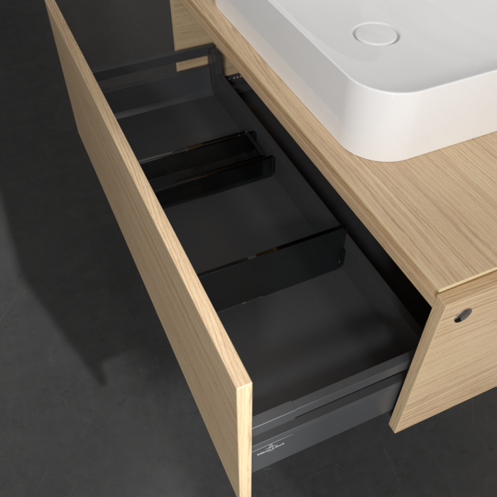 Практичные внутренние перегородки. Продуманные внутренние перегородки в мебели для ванной комнаты Villeroy & Boch позволяют индивидуально поддерживать порядок в ванной комнате. Различные элементы, такие как регулируемые стеклянные перегородки и ящики для аксессуаров различных размеров, обеспечивают порядок и хороший обзор.