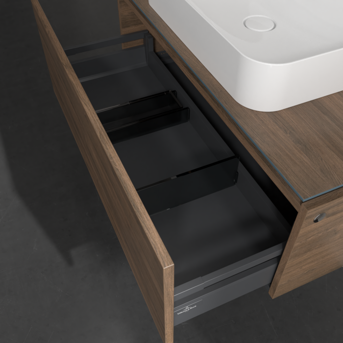 Практичные внутренние перегородки. Продуманные внутренние перегородки в мебели для ванной комнаты Villeroy & Boch позволяют индивидуально поддерживать порядок в ванной комнате. Различные элементы, такие как регулируемые стеклянные перегородки и ящики для аксессуаров различных размеров, обеспечивают порядок и хороший обзор.