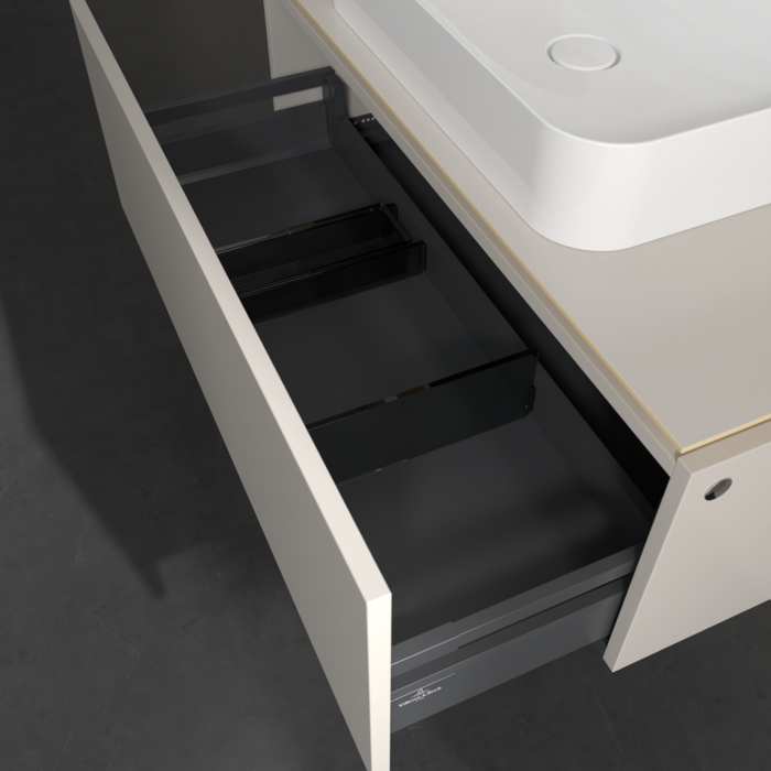 Практичные внутренние перегородки. Продуманные внутренние перегородки в мебели для ванной комнаты Villeroy & Boch позволяют индивидуально поддерживать порядок в ванной комнате. Различные элементы, такие как регулируемые стеклянные перегородки и ящики для аксессуаров различных размеров, обеспечивают порядок и хороший обзор.