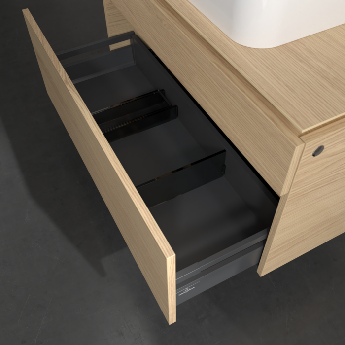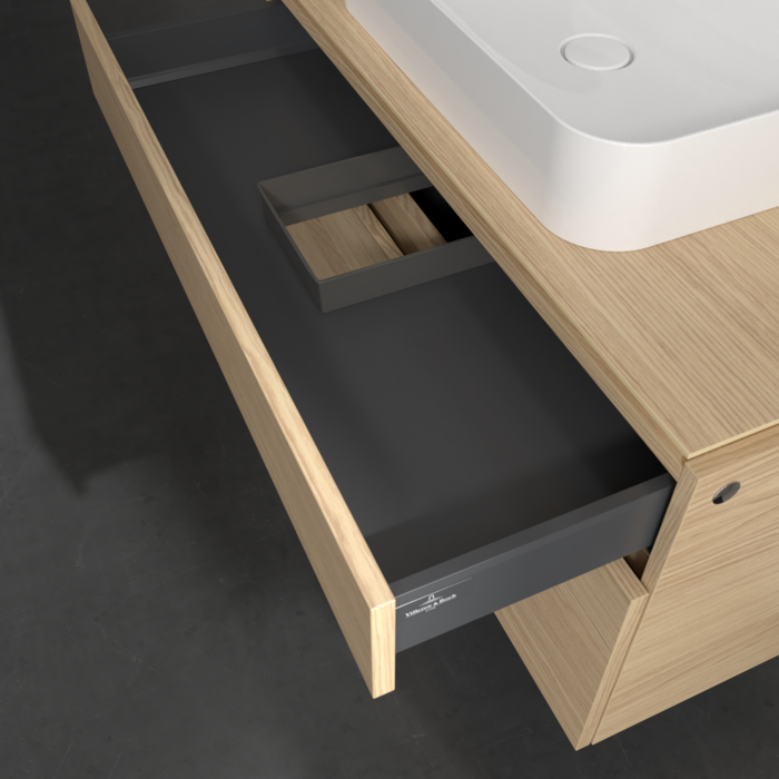 Практичные внутренние перегородки. Продуманные внутренние перегородки в мебели для ванной комнаты Villeroy & Boch позволяют индивидуально поддерживать порядок в ванной комнате. Различные элементы, такие как регулируемые стеклянные перегородки и ящики для аксессуаров различных размеров, обеспечивают порядок и хороший обзор.