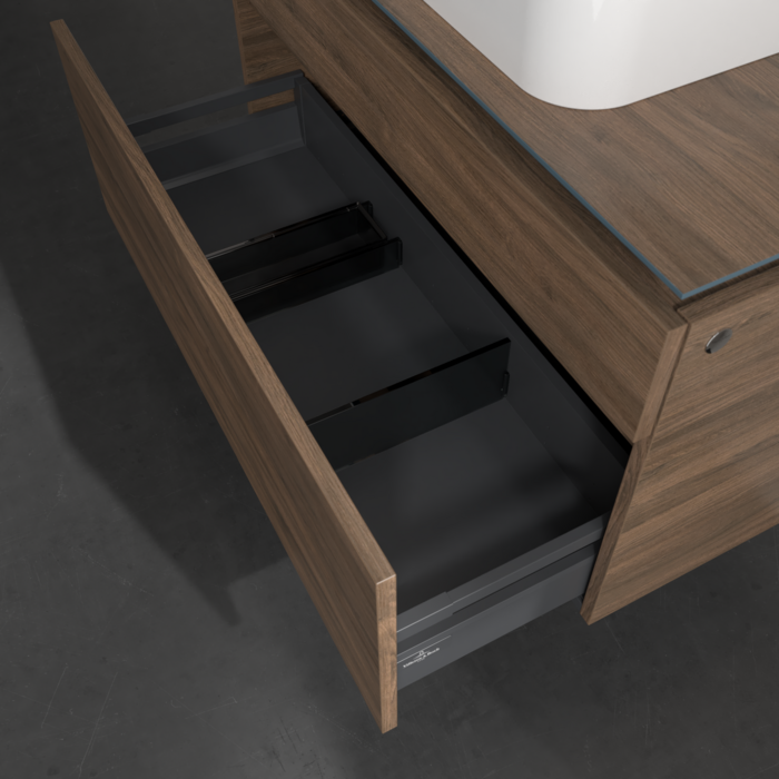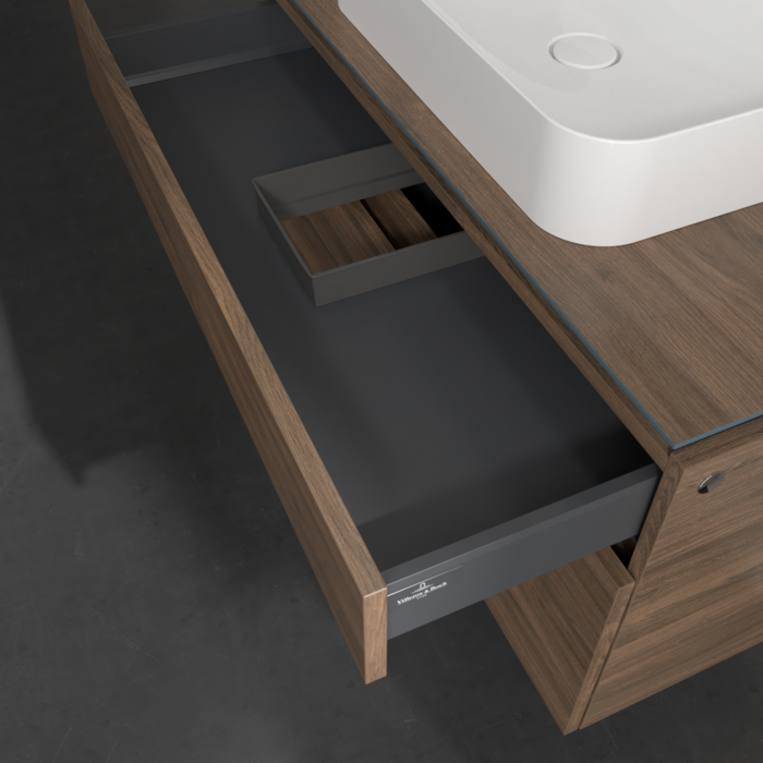 Практичные внутренние перегородки. Продуманные внутренние перегородки в мебели для ванной комнаты Villeroy & Boch позволяют индивидуально поддерживать порядок в ванной комнате. Различные элементы, такие как регулируемые стеклянные перегородки и ящики для аксессуаров различных размеров, обеспечивают порядок и хороший обзор.