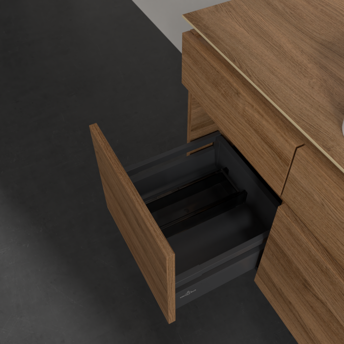 Практичные внутренние перегородки. Продуманные внутренние перегородки в мебели для ванной комнаты Villeroy & Boch позволяют индивидуально поддерживать порядок в ванной комнате. Различные элементы, такие как регулируемые стеклянные перегородки и ящики для аксессуаров различных размеров, обеспечивают порядок и хороший обзор.
