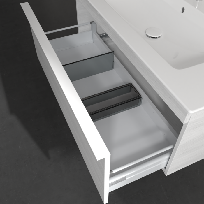 Продуманное внутреннее разделение мебели для ванной Villeroy & Boch позволяет создать индивидуальную систему организации пространства в ванной комнате. Элементы, расположение которых можно менять, например регулируемые стеклянные перегородки и контейнеры для аксессуаров различных размеров, обеспечивают хороший обзор и порядок. Благодаря практичной системе внутреннего разделения вы будете быстро находить принадлежности для ванной, которыми вы постоянно пользуетесь.