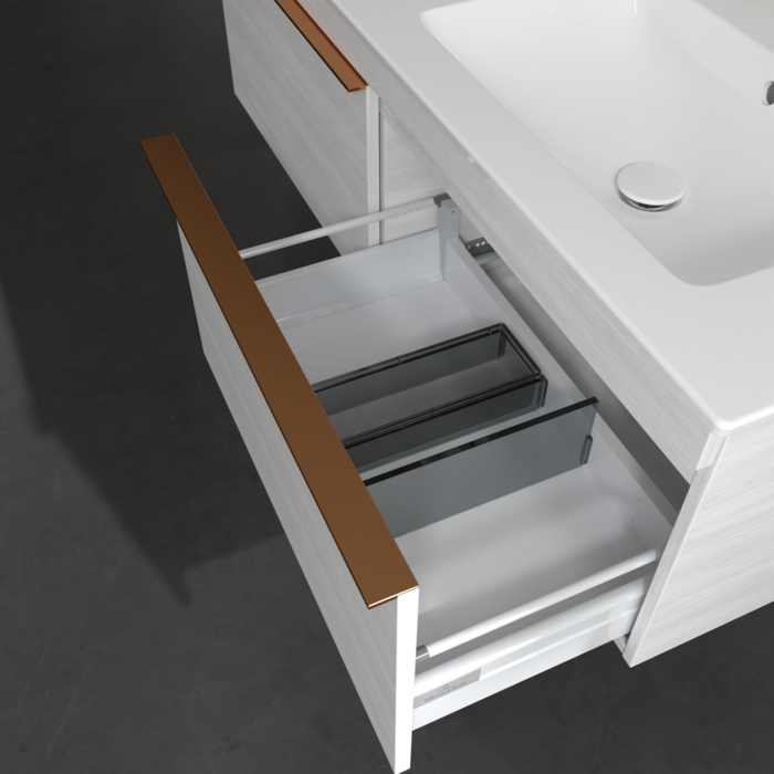 Продуманное внутреннее разделение мебели для ванной Villeroy & Boch позволяет создать индивидуальную систему организации пространства в ванной комнате. Элементы, расположение которых можно менять, например регулируемые стеклянные перегородки и контейнеры для аксессуаров различных размеров, обеспечивают хороший обзор и порядок. Благодаря практичной системе внутреннего разделения вы будете быстро находить принадлежности для ванной, которыми вы постоянно пользуетесь.