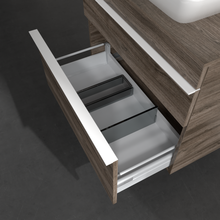 Продуманное внутреннее разделение мебели для ванной Villeroy & Boch позволяет создать индивидуальную систему организации пространства в ванной комнате. Элементы, расположение которых можно менять, например регулируемые стеклянные перегородки и контейнеры для аксессуаров различных размеров, обеспечивают хороший обзор и порядок. Благодаря практичной системе внутреннего разделения вы будете быстро находить принадлежности для ванной, которыми вы постоянно пользуетесь.
