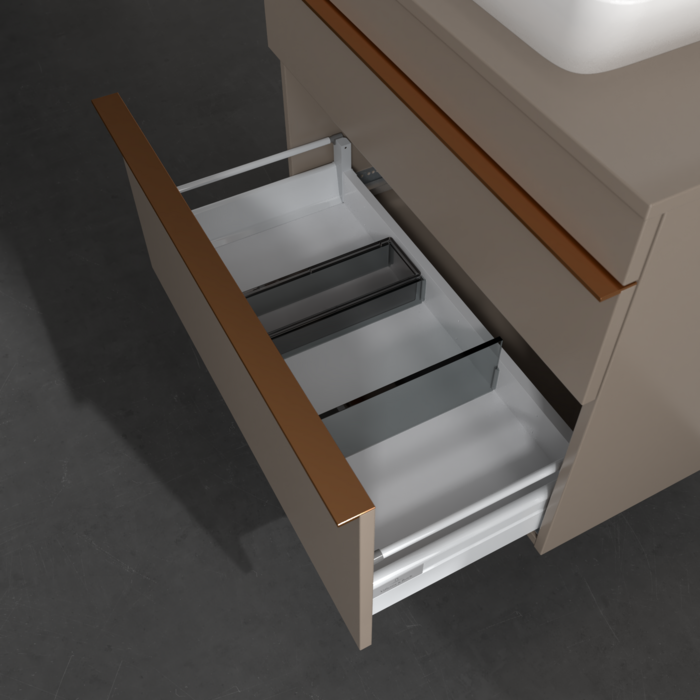 Продуманное внутреннее разделение мебели для ванной Villeroy & Boch позволяет создать индивидуальную систему организации пространства в ванной комнате. Элементы, расположение которых можно менять, например регулируемые стеклянные перегородки и контейнеры для аксессуаров различных размеров, обеспечивают хороший обзор и порядок. Благодаря практичной системе внутреннего разделения вы будете быстро находить принадлежности для ванной, которыми вы постоянно пользуетесь.