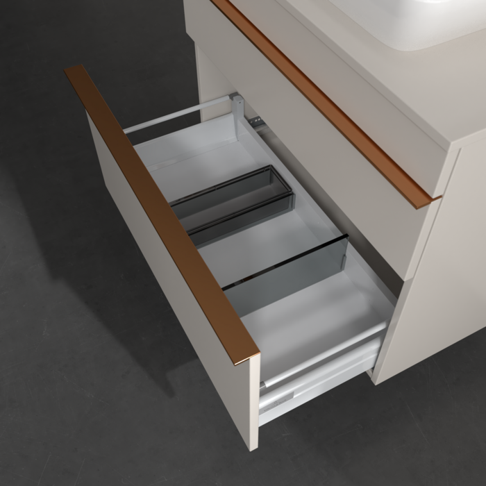 Продуманное внутреннее разделение мебели для ванной Villeroy & Boch позволяет создать индивидуальную систему организации пространства в ванной комнате. Элементы, расположение которых можно менять, например регулируемые стеклянные перегородки и контейнеры для аксессуаров различных размеров, обеспечивают хороший обзор и порядок. Благодаря практичной системе внутреннего разделения вы будете быстро находить принадлежности для ванной, которыми вы постоянно пользуетесь.