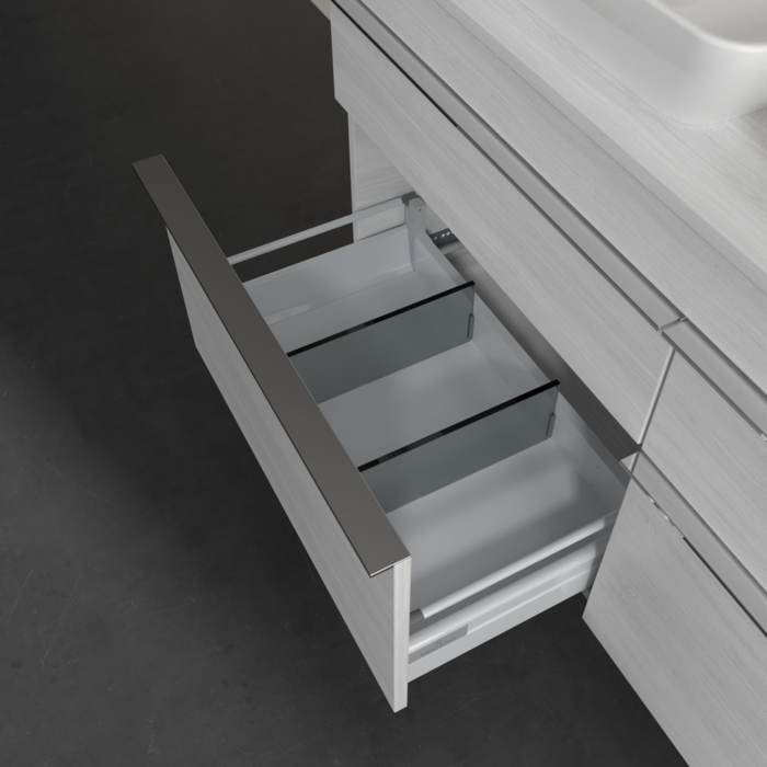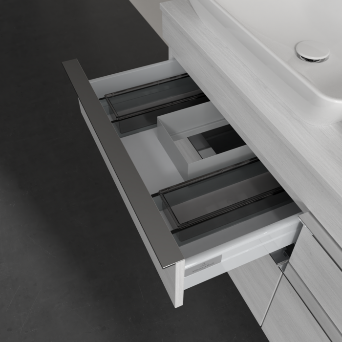 Продуманное внутреннее разделение мебели для ванной Villeroy & Boch позволяет создать индивидуальную систему организации пространства в ванной комнате. Элементы, расположение которых можно менять, например регулируемые стеклянные перегородки и контейнеры для аксессуаров различных размеров, обеспечивают хороший обзор и порядок. Благодаря практичной системе внутреннего разделения вы будете быстро находить принадлежности для ванной, которыми вы постоянно пользуетесь.