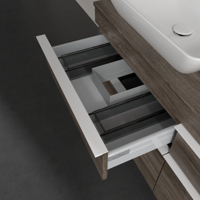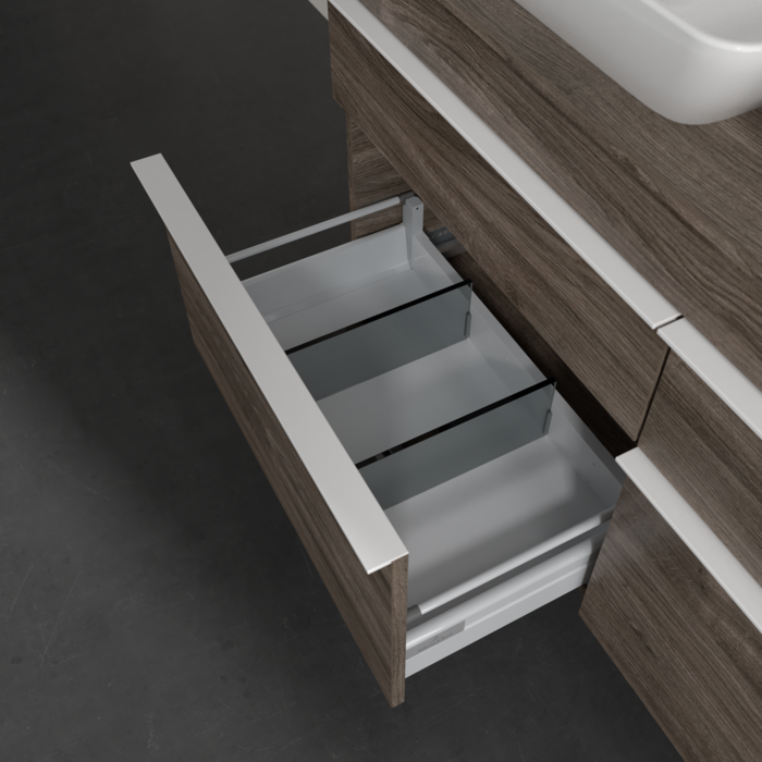 Продуманное внутреннее разделение мебели для ванной Villeroy & Boch позволяет создать индивидуальную систему организации пространства в ванной комнате. Элементы, расположение которых можно менять, например регулируемые стеклянные перегородки и контейнеры для аксессуаров различных размеров, обеспечивают хороший обзор и порядок. Благодаря практичной системе внутреннего разделения вы будете быстро находить принадлежности для ванной, которыми вы постоянно пользуетесь.