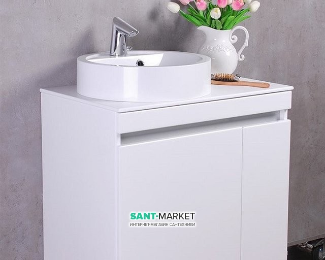 Данная модель шкафчика под умывальник является стандартным изделием и выпускается в белом цвете. Шкафчик комплектуется умывальником из литого камня, модель умывальника Renata 430.
