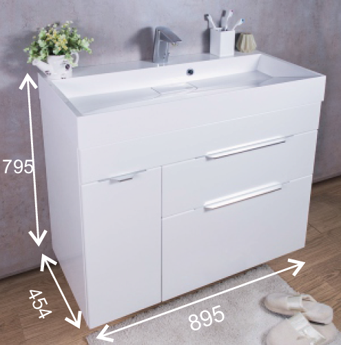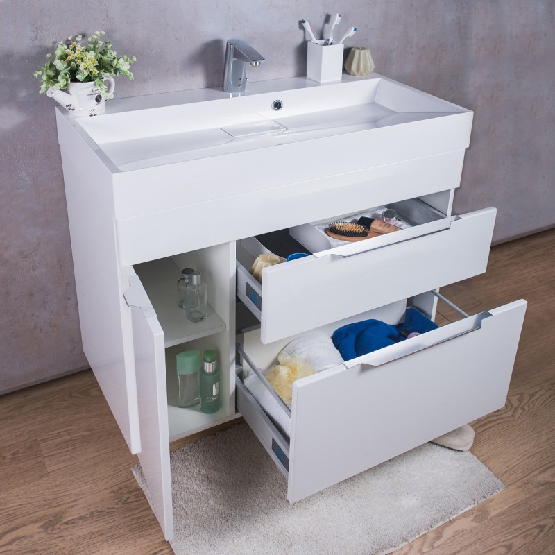 Комплект Bermuda 2, шкафчик с умывальником торговой марки Fancy Marble. Размер шкафчика 900х460х800 мм. Цвет белый. Модель предназначена для подвесного монтажа и комплектуется распашной дверцей и двумя глубокими ящиками с механизмом доводки. Шкафчик комплектуется умывальником из литого камня, модель умывальника Ashley 900C.