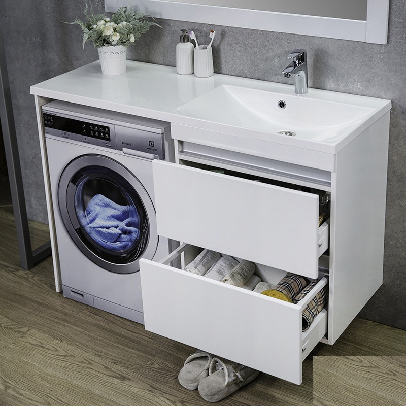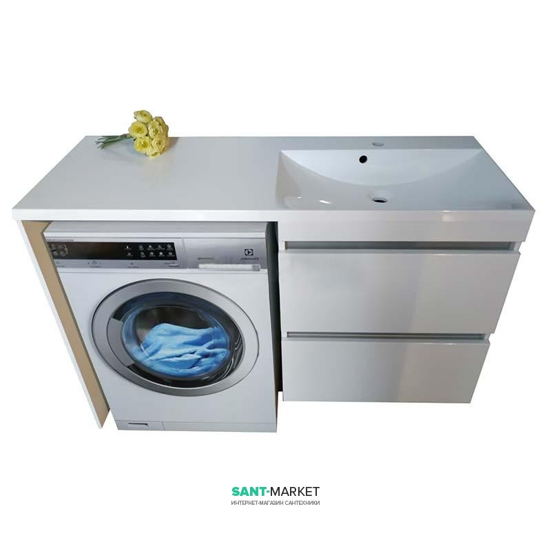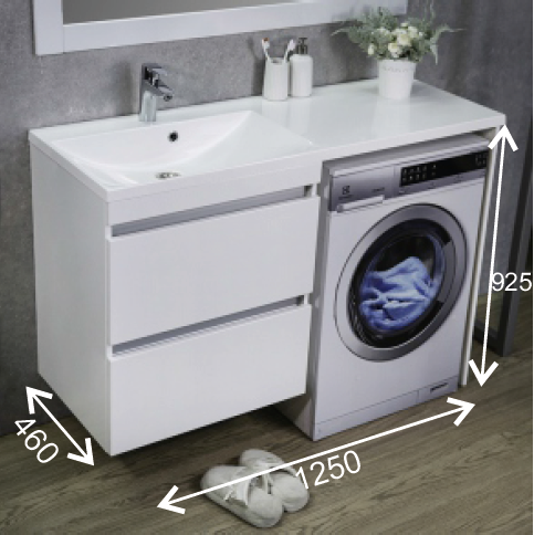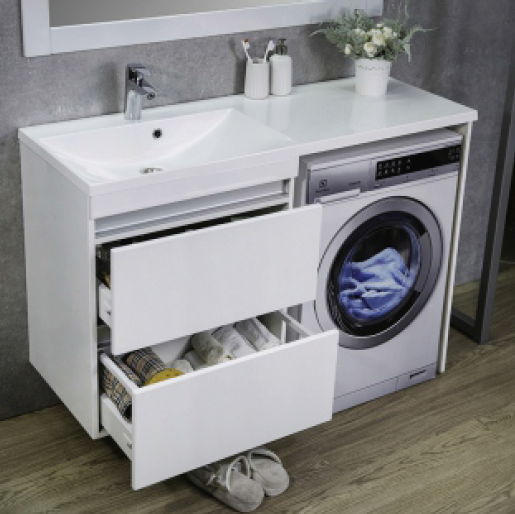 Тумбочка может быть как левая, так и правая, ориентируемся по чаше умывальника. Имеет два выдвижных ящика для удобного хранения ваших вещей длиной 600 мм с функцией плавного закрывания. Столешница на всю ширину конструкции позволяет разместить на ровной поверхности гигиенические средства, аксессуары для принятия ванны.