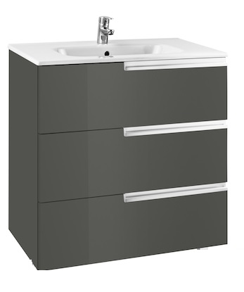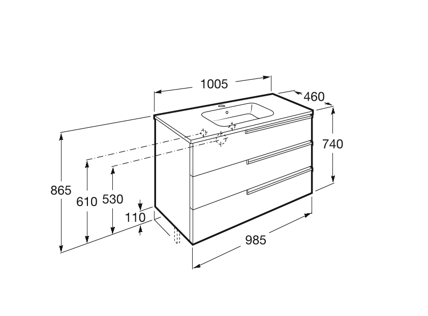 Умывальник с тумбой ROCA Victoria-N - вместительная, стильная и оригинальная модель, которая будет прекрасно смотреться в любой ванной комнате, поможет разместить большое количество вещей, благодаря наличию 3-х выдвижных ящиков, и поможет удобно разместить раковину. Изготовлена тумба из влагостойкого МДФ, а умывальник из высококачественной керамики с глянцевым покрытием. Раковина имеет отверстие для смесителя и перелив. Тумба устанавливается подвесным способом или на ножки, а умывальник устанавливается на тумбу. Размеры модели - 1005х460х740 мм.
