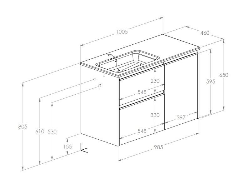 верхний ящик с вырезом под сифон, тумба без ручек (ручки можно купить отдельно)