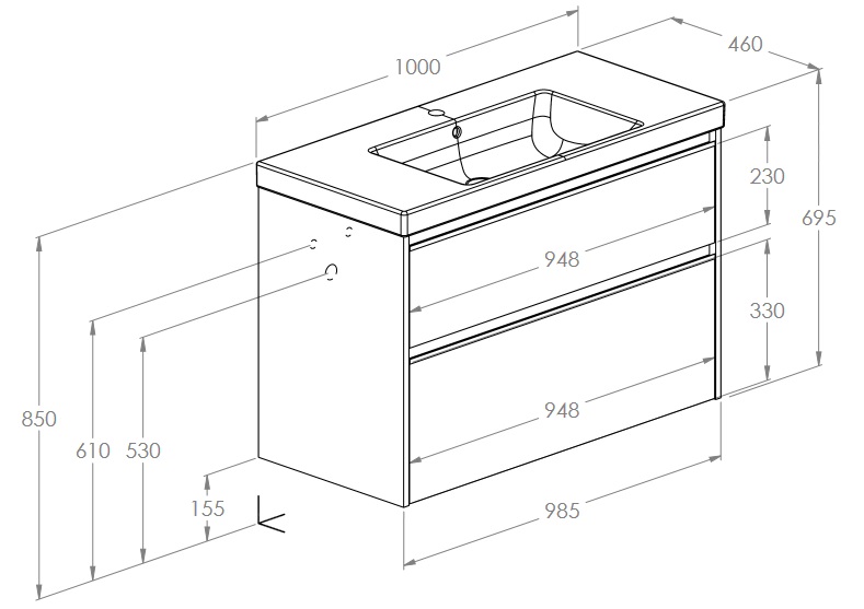 верхний ящик с вырезом под сифон, тумба без ручек (ручки можно купить отдельно), ящики с полным выдвижением и бесшумным закрыванием
