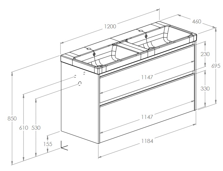 верхний ящик с вырезом под сифон, тумба без ручек (ручки можно купить отдельно), ящики с полным выдвижением и бесшумным закрыванием