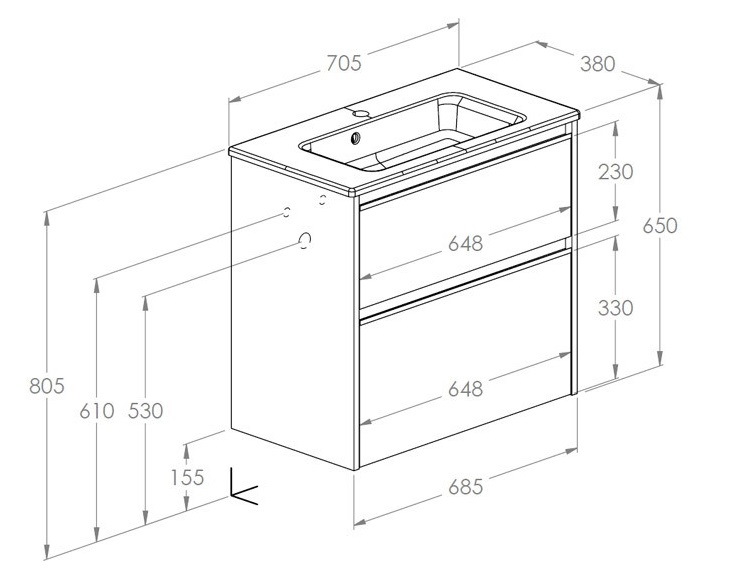 верхний ящик с вырезом под сифон, тумба без ручек (ручки можно купить отдельно), ящики с полным выдвижением и бесшумным закрыванием
