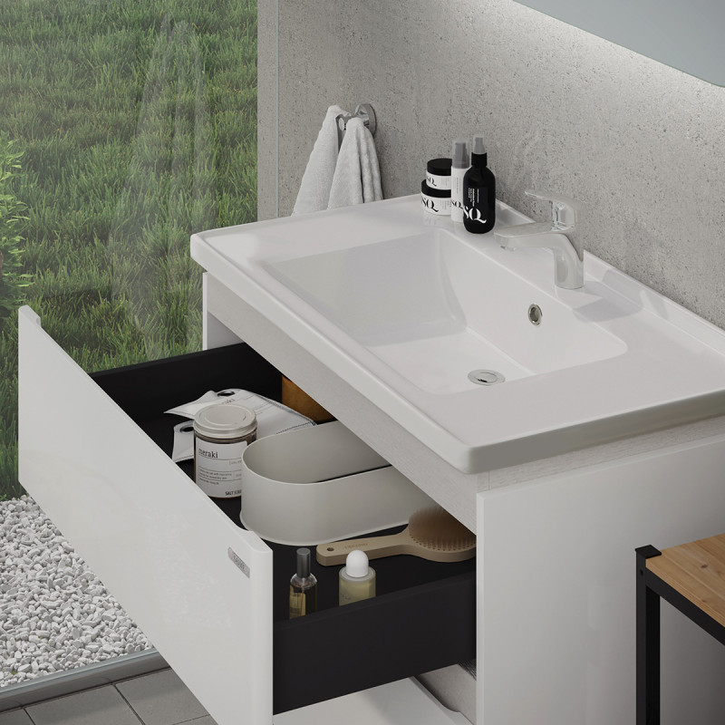 Коллекция AMATA - это вершина модельного ряда. У данной коллекции несколько ключевых отличий: первоклассный импортный керамический умывальник (Турция), внутреннее наполнение ящиков в цвете темно-серый графит, белые рейлинги, толстые фасады из 19 мм МДФ, боковины МДФ, декоративная вставка RENOLIT (Германия) с имитацией крашенного шпона.