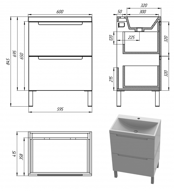 Размеры тумбы (ш*г*в): 600х415х650 мм + ножки 150 мм