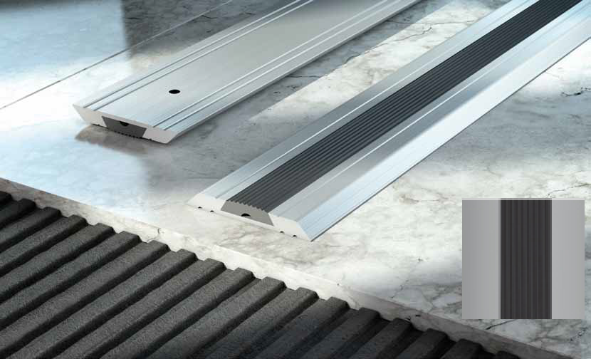 Двоколірний алюмінієвий противоскользящий профіль. Повна безпека і захист країв сходових ступенів. Застосовується на сходових ступенях, на плоских поверхнях для зовнішніх і внутрішніх робіт.
