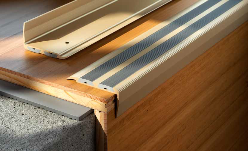 Двоколірний алюмінієвий противоскользящий кут. Повна безпека і захист країв сходових ступенів.