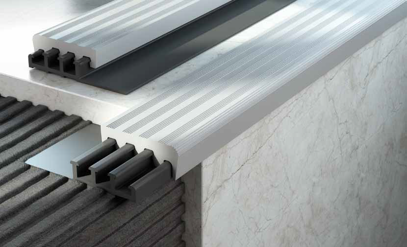 Профіль складається з двох частин - основи, встановленої під плиткою і верхньої антиковзаючою частини. Захист країв сходових ступенів.