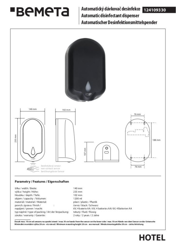 Автоматичний дозатор для дезінфікуючого засобу Bemeta Hotel 1200 мл чорний пластик матовий 124109330