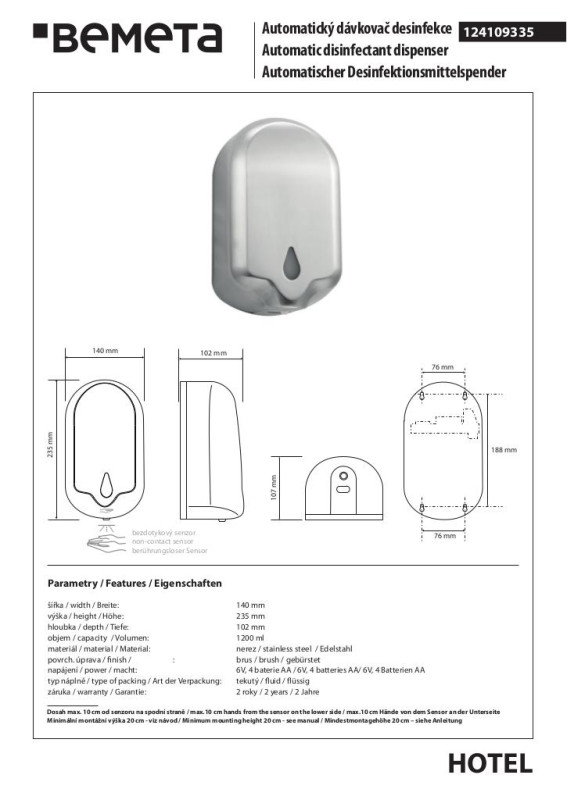 Автоматичний дозатор для дезинфікуючого засобу Bemeta Hotel 1200 мл матова нержавіюча сталь