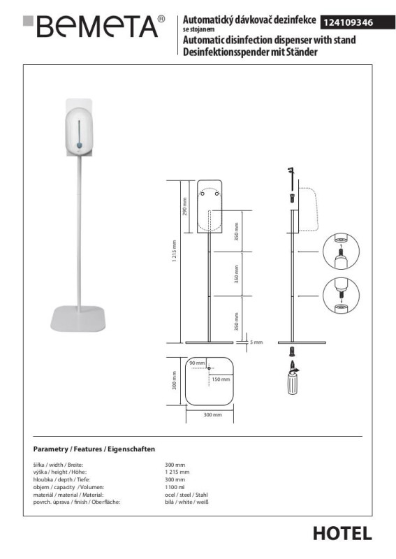 Автоматичний дозатор для дезінфекції Bemeta Hotel 1100 мл з підставкою нержавіюча сталь/пластик білий