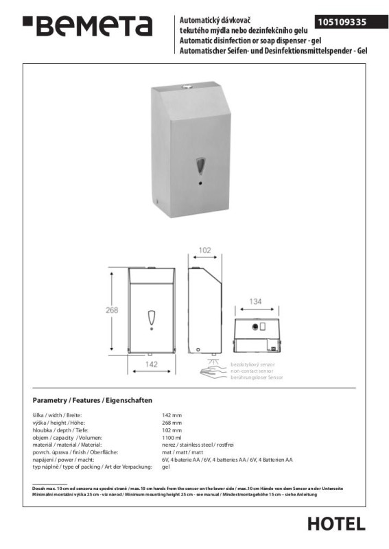 Автоматичний дозатор для рідкого мила/дезінфекції Bemeta Hotel 1100 мл матова нержавіюча сталь 105109335