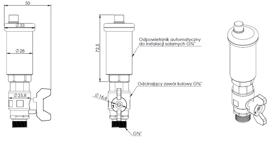 Автоматичний розпилювач для сонячних установок з кульовим вентилем. Автоматичний розподільник призначений для видалення повітря із закритих опалювальних установок відповідно до PN-EN 12828. Під час зливу установки автоматичні розподільники єповітряними клапанами. Автоматичний сонячний розподільник при нормальному функціонуванні сонячної системи повинен бути відрізаний від нього. Використовується тільки для випуску повітря при заповненні установки.