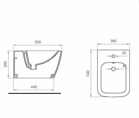 1) Біде підвісне Ponsi Wave 36х53 см кераміка білий глянець