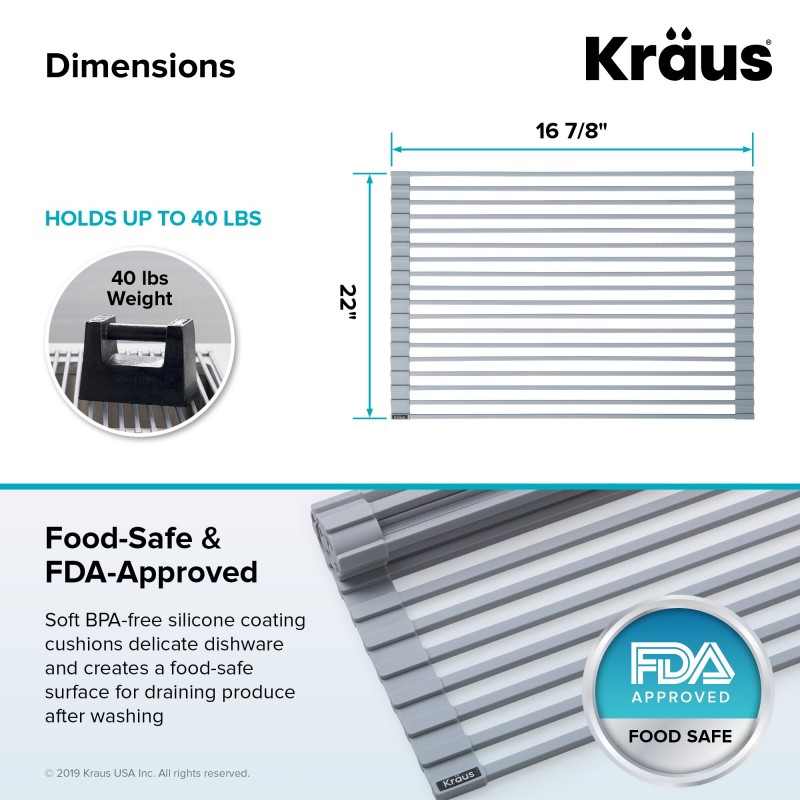 Жодну сучасну кухню не можна уявити безуніверсальної силіконової сушки від Kraus. Багатофункціональний і необхідний кухонний аксесуар відрізняється стильним зовнішнім виглядом і універсальністю використання. Встановіть її поверх кухонного миття, щоб промити і висушити свіжі продукти.