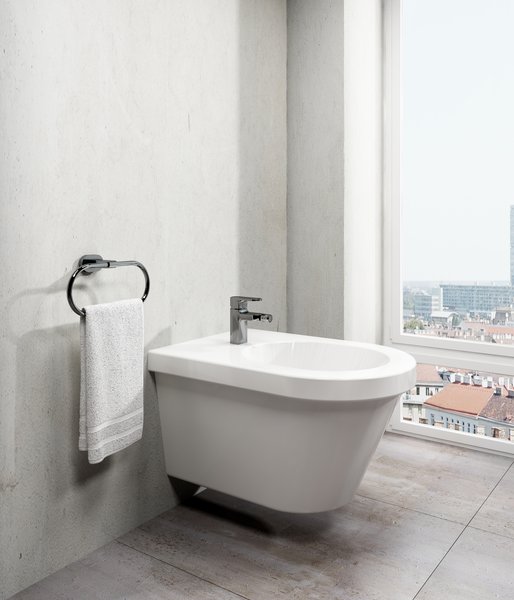 Чисто дизайнерське рішення складається з простого стилю без відволікаючих зайвих деталей. Його зовнішній вигляд доповнює асортимент концепції Chrome і підходить для розміщення разом з WC Chrome RimOff. Монтаж на стіну допоможе полегшити щоденну підтримку гігієни на підлозі ванної кімнати або туалету. Без обідка і граней, де може осісти бруд. Для гармонійного виду ванної кімнати або туалету, біде підходить на додаток до інших продуктів Chrome.
