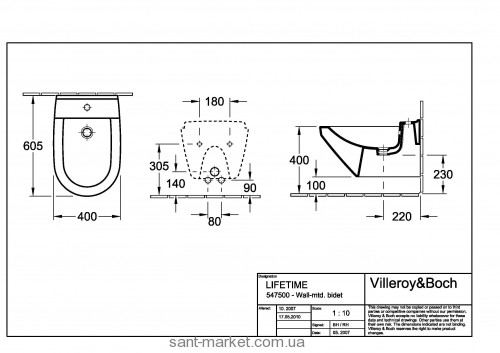 Біде підвісне Villeroy & Boch колекція Lifetime 61х40х40 з перелівоі 547500R1