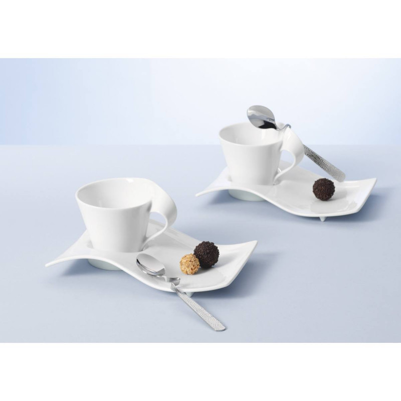 Кава за сніданком, після обіду або в будь-який час дня - з посудом для кави з колекції NewWaveCaffè насолоду улюбленим напоєм стане ще і естетичним задоволенням. Чашки різних форм для всіх популярних видів кави виготовлені з тонкого фарфору преміум-класу, їх можна використовувати в мікрохвильовій печі і мити в посудомийній машині. Елегантна посуд для кави з колекції NewWave Caffè відрізняється оригінальною вигнутою формою, яка виробляє особливо сильне враження завдяки мінімалістичному дизайну. Чашка стоїть на зігнутому у вигляді хвилі великому блюдце, на якому можна ефектно розмістити невелике ласощі, наприклад кекс або круасан.