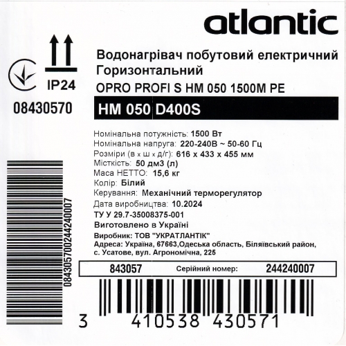 Бойлер Atlantic Opro Horizontal HM50 D400S-1-M 1500W мокрий ТЕН білий 843057