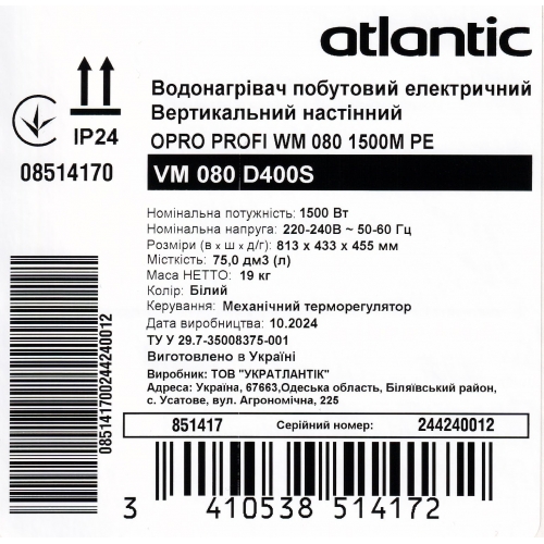 Бойлер Atlantic Opro Profi VM 080 D400S 1500W мокрий ТЕН білий 851417
