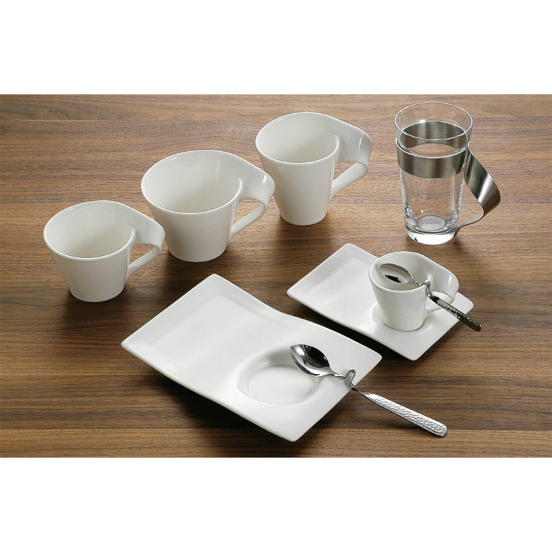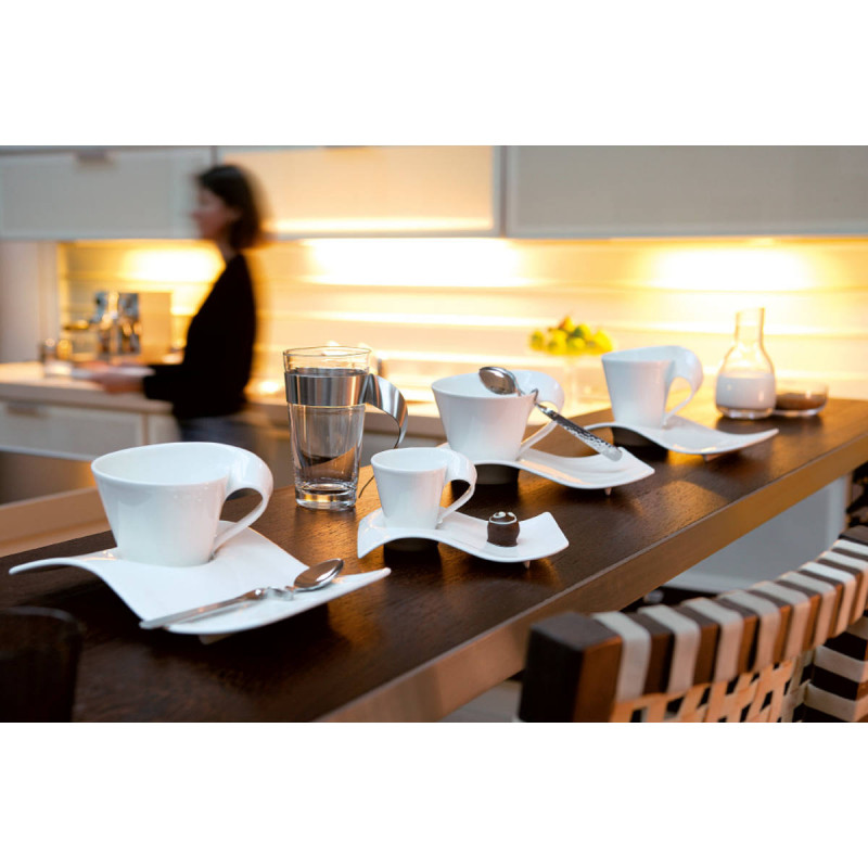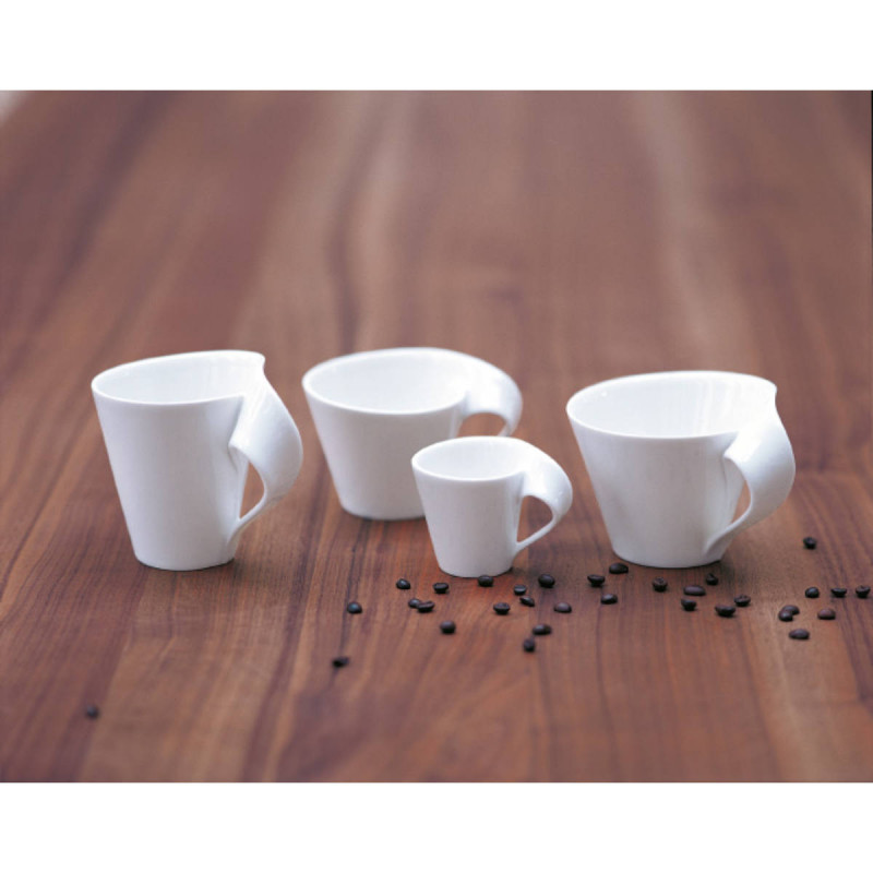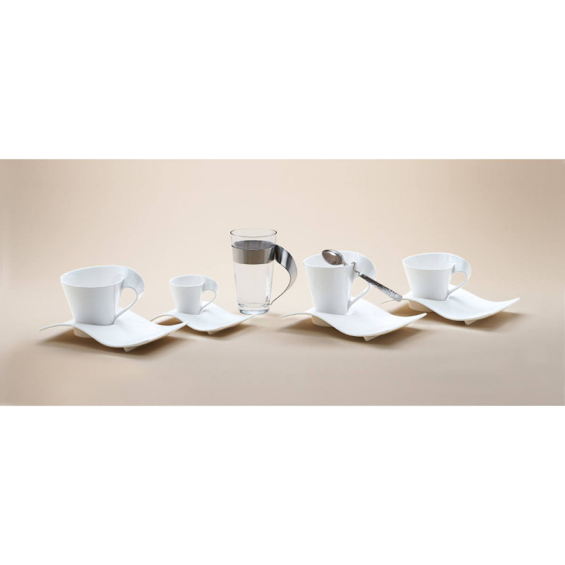 Кава за сніданком, після обіду або в будь-який час дня - з посудом для кави з колекції NewWaveCaffè насолоду улюбленим напоєм стане ще і естетичним задоволенням. Чашки різних форм для всіх популярних видів кави виготовлені з тонкого фарфору преміум-класу, їх можна використовувати в мікрохвильовій печі і мити в посудомийній машині. Елегантна посуд для кави з колекції NewWave Caffè відрізняється оригінальною вигнутою формою, яка виробляє особливо сильне враження завдяки мінімалістичному дизайну. Чашка стоїть на зігнутому у вигляді хвилі великому блюдце, на якому можна ефектно розмістити невелике ласощі, наприклад кекс або круасан.