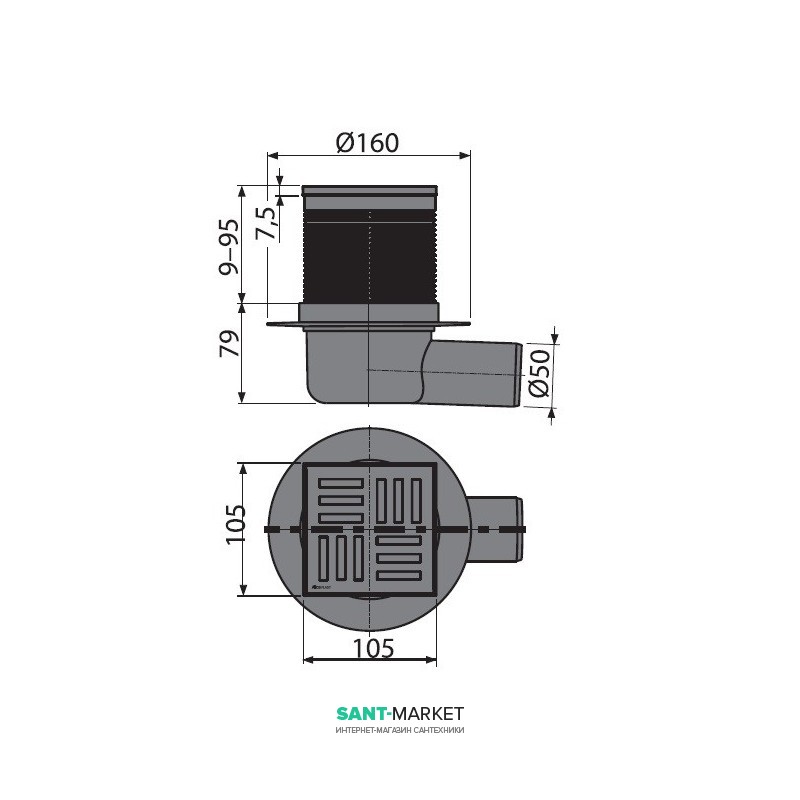 Cливной трап для душу AlcaPlast мокрий затвор горизонтальний випуск на рівні підлоги 105х105 APV5111