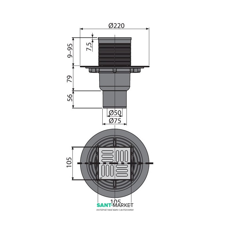 Cливной трап для душу AlcaPlast мокрий гідрозатвор прямий випуск 105х105 APV201
