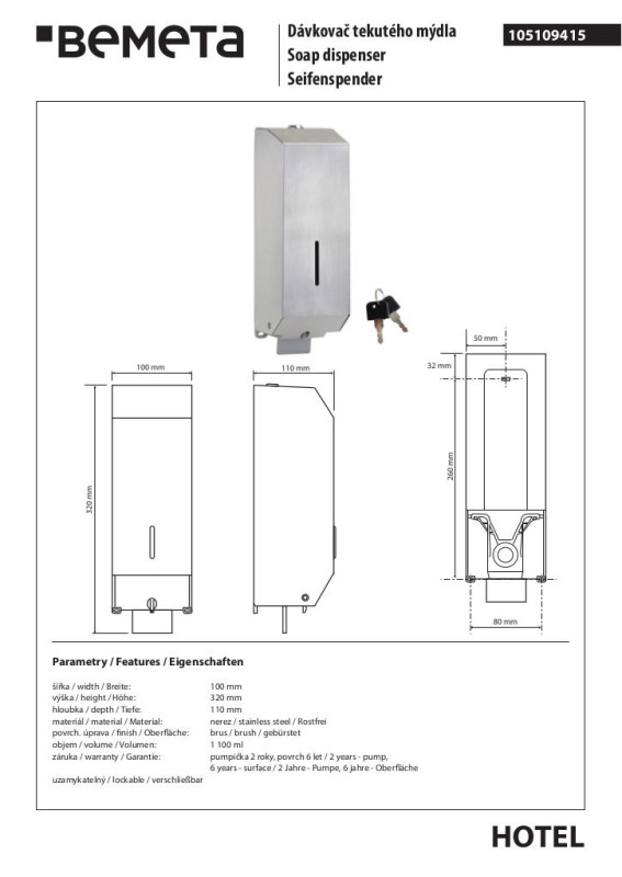 Диспенсер для рідкого мила Bemeta Hotel 1100 мл нержавіюча сталь матова 105109415