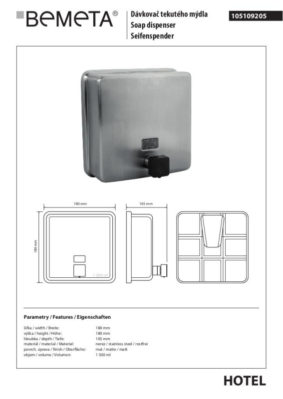 Диспенсер для рідкого мила Bemeta Hotel 1500 мл нержавіюча сталь матова 105109205
