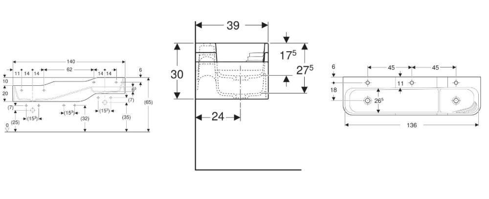 3 умивальні зони, 3 різні висоти, нижній умивальник зліва