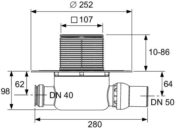 - корпус трапа пластиковий (РР) з горизонтальним поворотним відведенням DN50 і горизонтальним прямим відведенням DN40 з заглушкою
