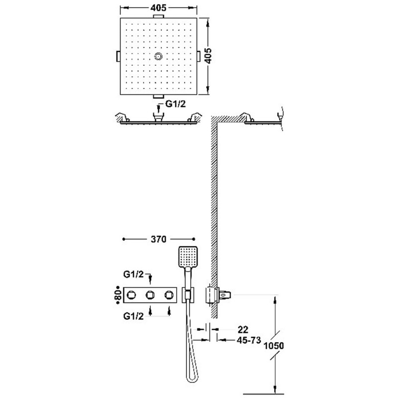 - Вбудований верхній душ 405х405 мм з нержавіючої сталі з 2 типами струменя (дощовий/вільний потік) )