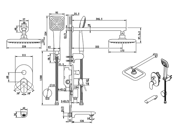 Комплектація: ручний душ, шланг, настінний тримач, тримач, виливши на ванну, змішувач для душа, підключення для душового шланга