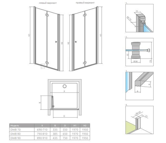 - Скло кріпиться до стіни за допомогою пристінних профілів (з регулюванням).